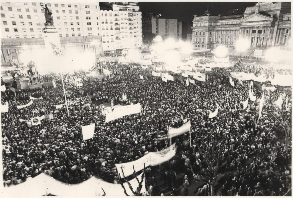 Tras la derrota en la guerra de Malvinas, la ilusión por la recuperación de la institucionalidad política fue creciendo con nitidez entre la ciudadanía. Este clima de época se reflejó en los discursos de campaña de los candidatos partidarios, una vez conocida la apertura electoral. Raúl Alfonsín, el candidato presidencial de la UCR, llegó a afirmar que “con democracia se come, se cura y se educa” e incentivaba a la población al terminar sus discursos con el rezo laico del preámbulo. La exteriorización de la efervescencia ciudadana en demanda de la democratización se observó también en las calles, donde la gente se manifestaba espontáneamente. También la movilización fue encauzada por los partidos políticos, quienes venían exigiendo desde 1981 el retorno del régimen constitucional y acentuaron esa posición ante el derrumbe sucesivo a la derrota bélica de Malvinas. Pero la recuperación democrática fue también un punto de llegada de las luchas de otros actores, entre ellos, los organismos de Derechos Humanos, y el movimiento obrero organizado.