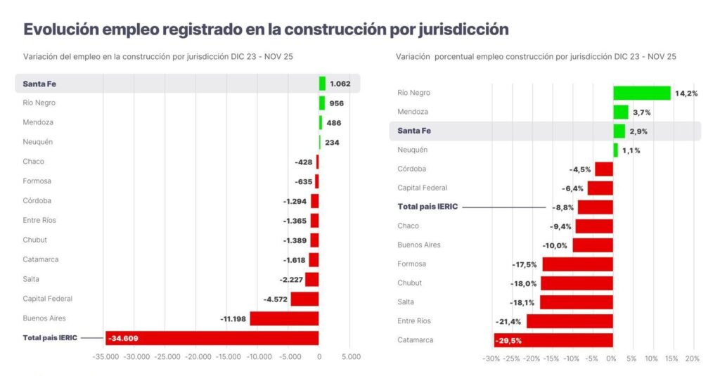Según un informe elaborado por el Observatorio Laboral del Ministerio de Trabajo, Empleo y Seguridad Social de Santa Fe, a partir de datos del Instituto de Estadística y Registro de la Industria de la Construcción (Ieric), entre diciembre de 2023 y noviembre de 2025 el empleo registrado en la construcción cayó 8,8 % a nivel nacional, lo que equivale a unos 34.600 puestos menos en todo el país. En el mismo período, la provincia creció 2,9% y sumó 1.062 empleos formales directos, convirtiéndose en la jurisdicción que más empleo creó en términos absolutos en ese lapso.
