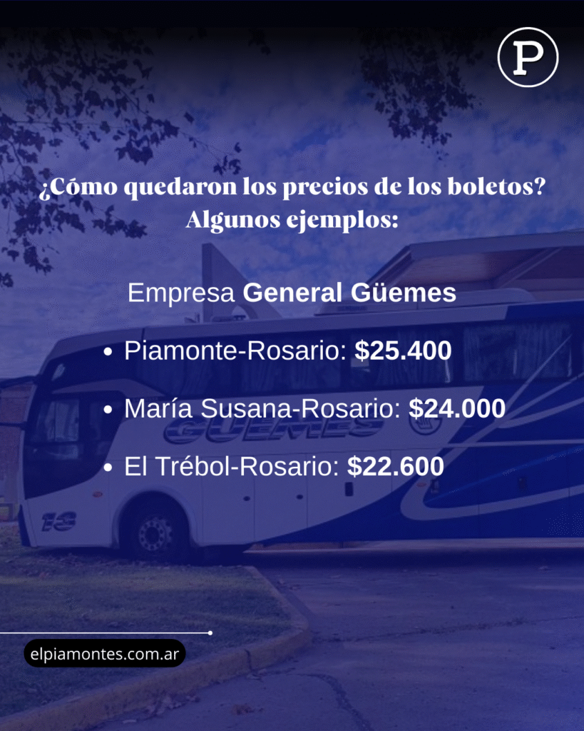 A partir de este nuevo cuadro, por ejemplo, un pasaje de la empresa General Güemes para cubrir el tramo Piamonte-Rosario pasó de costar $19.800 a $25.400. Desde y hacia María Susana, el costo es de $24.000; y desde El Trébol $22.600.