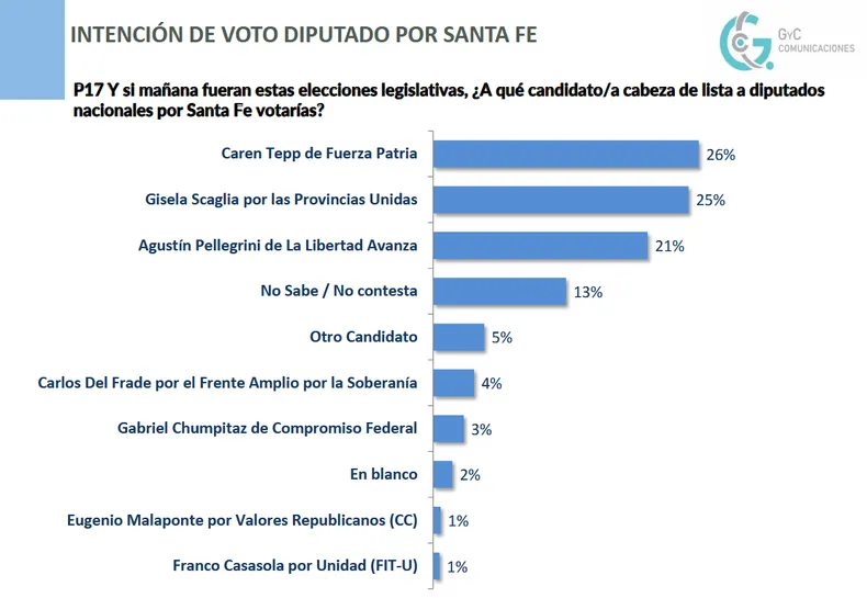 Un sondeo de la consultora GyC Comunicaciones muestra un escenario de paridad con Provincias Unidas, espacio que lidera el gobernador Maximiliano Pullaro y postula a Gisela Scaglia, y Fuerza Patria, encabezado por Caren Tepp peleando el primer lugar, mientras que La Libertad Avanza pierde terreno.