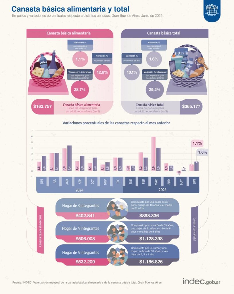 Una familia tipo, integrada por cuatro personas, necesitó $1.128.398 para no ser pobre en junio, según la Canasta Básica Total (CBT) informada por el Instituto Nacional de Estadísticas y Censos (Indec).