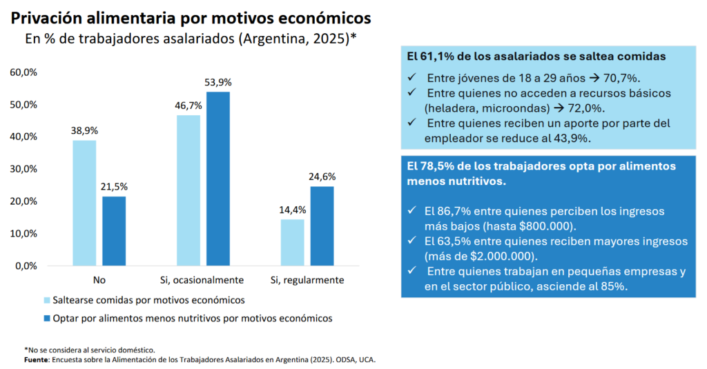 Según un relevamiento del Observatorio de la UCA, ocho de cada diez trabajadores en Argentina restringieron la cantidad de comida o resignaron su calidad nutricional durante la jornada de trabajo, debido a motivos económicos.