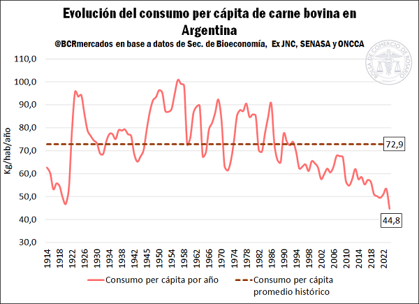 “Se proyecta que el consumo anual por habitante promedio en 2024 sea de sólo 44,8 kilogramos, muy por debajo del promedio histórico (72,9 kilogramos) e incluso por debajo del piso del año 1920, cuando se habían consumido 46,9 kilogramos por habitante. Pese a todo, en la comparativa internacional Argentina continúa siendo uno de los países con mayor consumo per cápita, con una ingesta prácticamente igual al de Uruguay y superando ampliamente a Estados Unidos (38 kg.), Australia (27 kg.) y Chile (26 kg.)”, advierte el informe de la Bolsa rosarina.