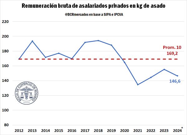 De acuerdo con las proyecciones de la Bolsa de Rosario, la remuneración bruta promedio del sector asalariado alcanzaría para comprar 146,6 kilogramos de asado en el 2024. Este dato indica una caída del 5,6% con respecto al 2023, cuando el poder de compra de los sueldos era de 155,2 kilos, y es uno de los factores explicativos detrás de la caída en el consumo cárnico que se viene experimentando este año.