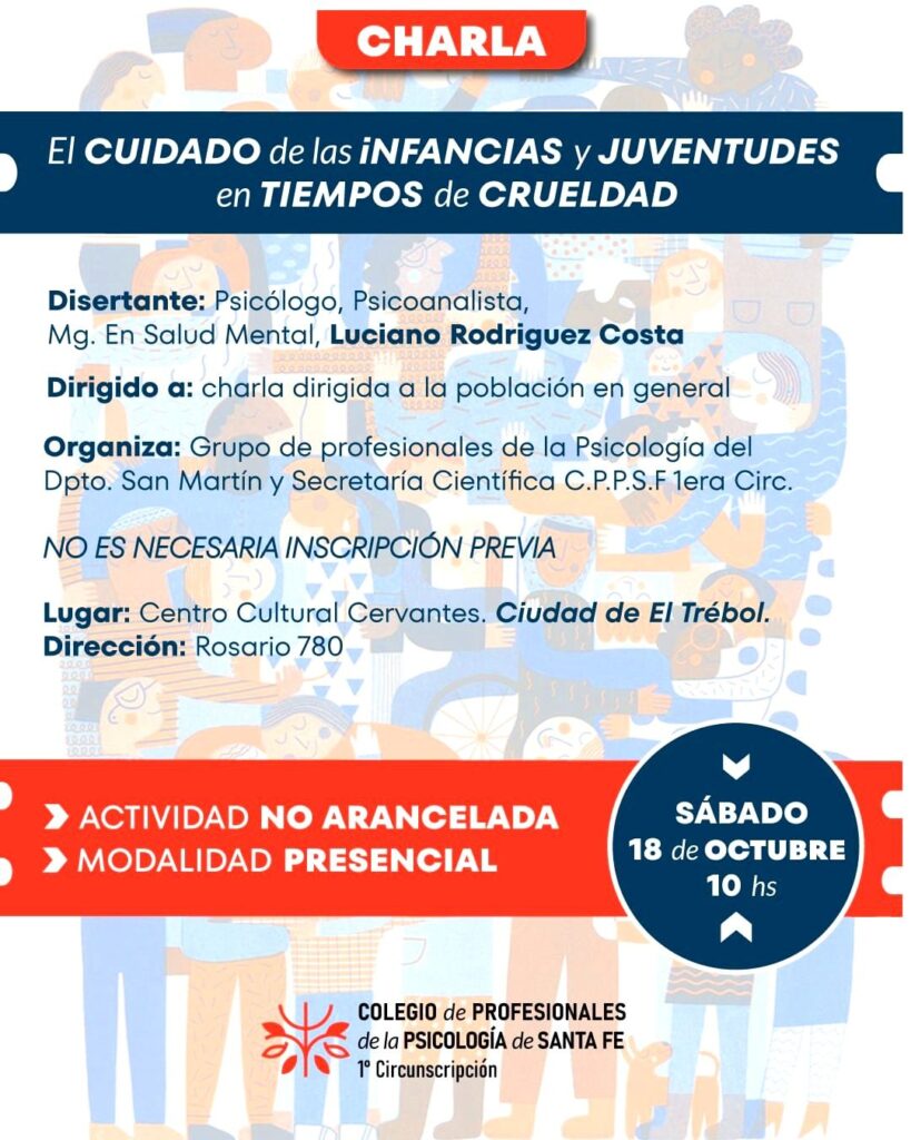 Desde el Grupo de Profesionales de la Psicología del Departamento San Martín, en conjunto con el Colegio de Profesionales de la Psicología de Santa Fe 1° Circunscripción invitan a la comunidad en general a la charla “El cuidado de las infancias y juventudes en tiempos de crueldad” a cargo del disertante psicólogo, psicoanalista y Mg. en Salud Mental, Luciano Rodríguez Costa.