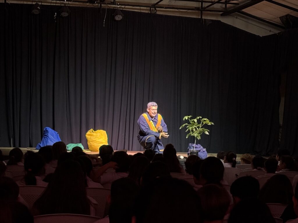 A su turno, Horacio Galarza dio detalles de la obra que protagoniza. “Es un viajero del tiempo, un maestro al que envían a este tiempo para tratar de brindar información, pero también llevarse información para su tiempo y mejorar la relación con el ambiente y poner atención en los residuos que generamos, sobre todo en los residuos cotidianos”, sintetizó el docente y actor.