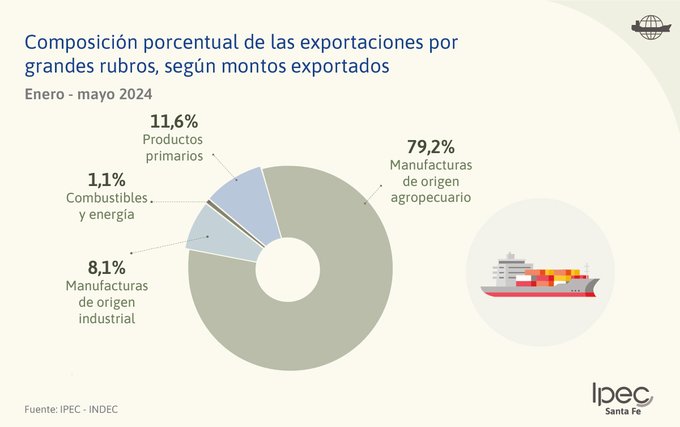 El Instituto Provincial de Estadística y Censos (Ipec) publicó el informe “Exportaciones con origen en la provincia de Santa Fe” que releva datos del período enero – mayo de 2024.