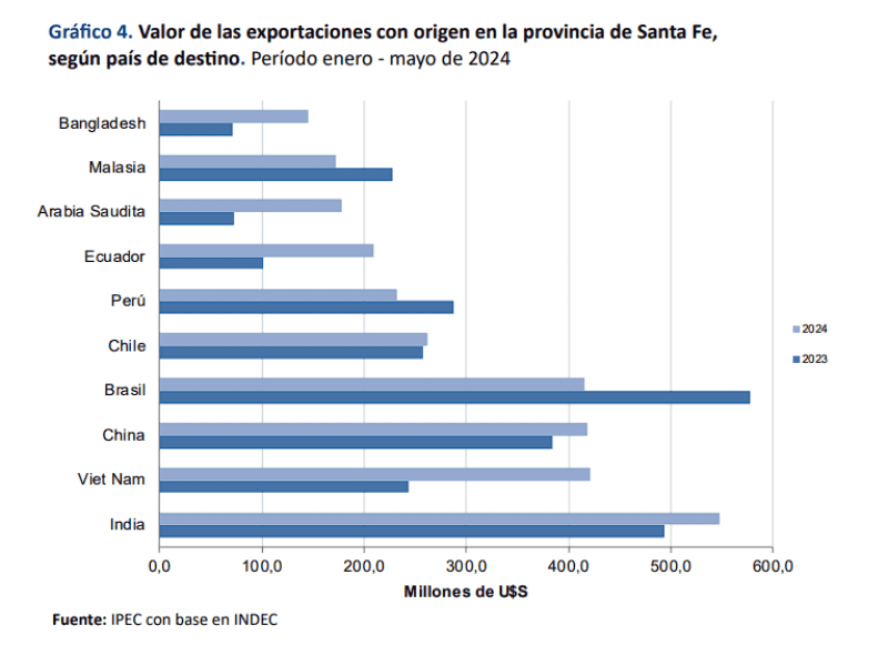 ¿Cuáles son los principales destinos de las exportaciones santafesinas?
