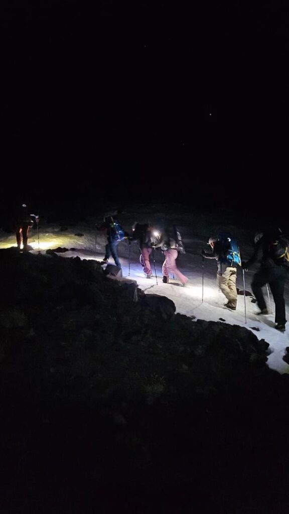En ese momento, cuentan, les explicaron cuestiones técnicas del ascenso: se frena poco, no se toma mucha agua y hay que seguir estrictamente el paso del guía. “Paso en falso, precipicio”, esas fueron las palabras que les dijeron. Además, el primer tramo es el más rocoso, llamado acarreo. “Tenés que tener mucho cuidado”, dijeron, y remarcaron: “De noche salís con linterna hasta que amanece. Y si no ves dónde pisás, no la contás”.