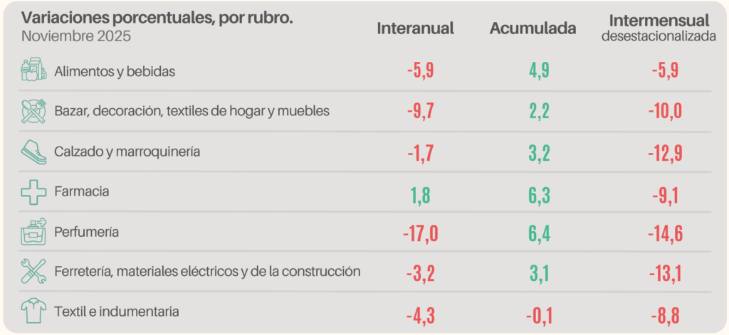 Al desagregar los datos se evidenció que seis de los siete rubros relevados presentaron retracciones, siendo los descensos más agudos los de Perfumería (-17%), Bazar y decoración (-9,7%) y Alimentos y bebidas (-5,9%). En contrapartida, el único sector con un crecimiento interanual fue Farmacia, con una suba del 1,8%.