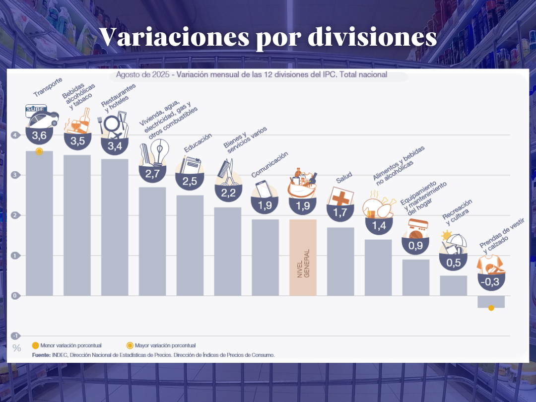 Del informe se desprende que las divisiones de mayor aumento fueron transporte (3,6%), bebidas alcohólicas y tabaco (3,5%), restaurantes y hoteles (3,4%), vivienda, agua, electricidad, gas y otros combustibles (2,7%), educación (2,5%) y bienes y servicios varios (2,2%).