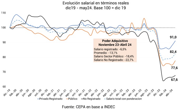 Si se realiza una estimación interanual, la caída es mayor: comparado con mayo de 2023, se registra una caída del 16,1% en términos reales y -13,1% en poder de compra en tan solo 6 meses (diciembre 2023 a mayo 2024).