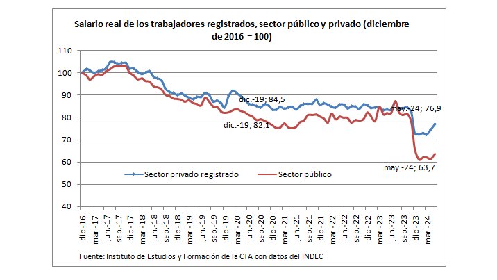 El salario nominal de los trabajadores registrados le ganó a la inflación en mayo y recortó la caída en términos reales. Según los propios datos del Indec, contra noviembre de 2023 el sector privado acumula una caída del 6,5% y el sector público sigue un 18,4% abajo.