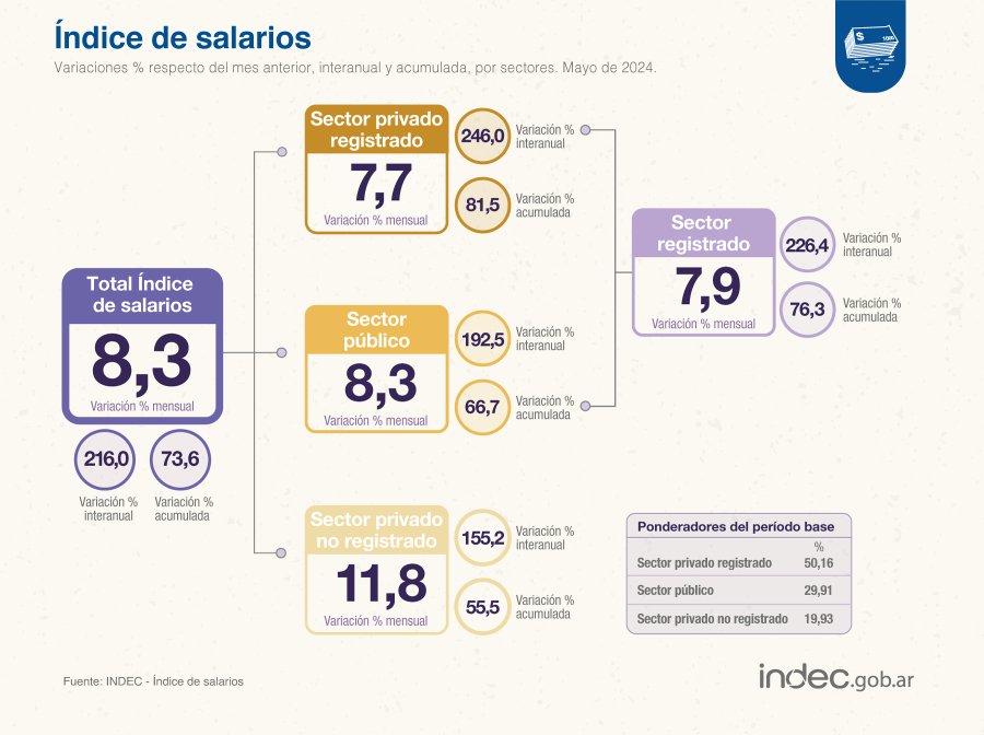 De acuerdo al último informe difundido por el Indec, el índice de salarios subió 8,3% en mayo de 2024 respecto del mes previo. Desde el organismo precisaron que durante los primeros cinco meses del año alcanzaron un incremento del 73,6% y en el acumulado interanual llegaron al 216% .