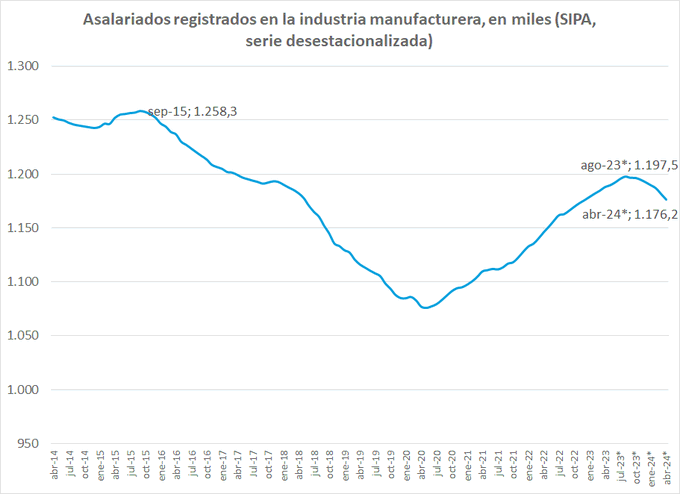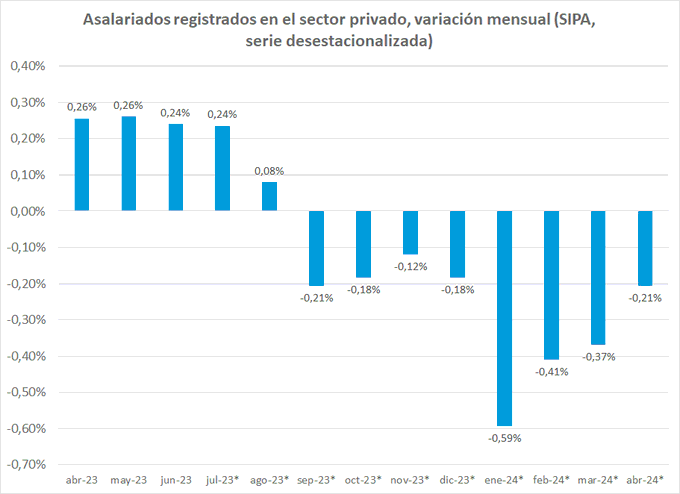 En el sector privado la caída de abril fue del 0,21% (12.929 trabajadores). “Ya van ocho meses consecutivos de deterioro. Desde agosto de 2023 el retroceso acumulado es del 2,25% (144.160 trabajadores)”, explicó el especialista en el mundo del trabajo.