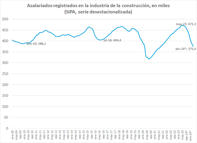 “La caída del empleo registrado en el sector privado se explica fundamentalmente por el comportamiento de la construcción y la industria, que al menos por ahora están lejos de encontrar un piso”, contextualizó en X.