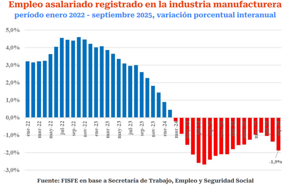 El informe de la cámara del sector indica que el total de personas con empleo registrado del sector privado en la industria manufacturera registró en septiembre de 2025 (último dato disponible) una disminución de 1,9% interanual, equivalente a 21,9 mil personas con empleo formal menos respecto al mismo mes de 2024.