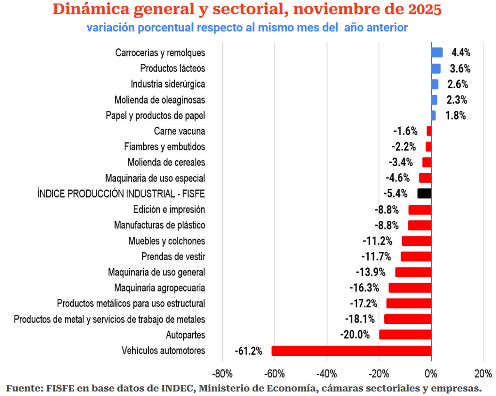 Según un relevamiento de la Federación Industrial de Santa Fe (Fisfe), el sector fabril provincial sufrió en noviembre una “marcada y generalizada” disminución de 5,4% interanual. El informe publicado por la cámara empresarial indica que el 75% de las ramas industriales presentó una caída, revelando el extenso alcance de la crisis. Por su parte, el indicador desestacionalizado de producción se redujo un 1,2% respecto de octubre.