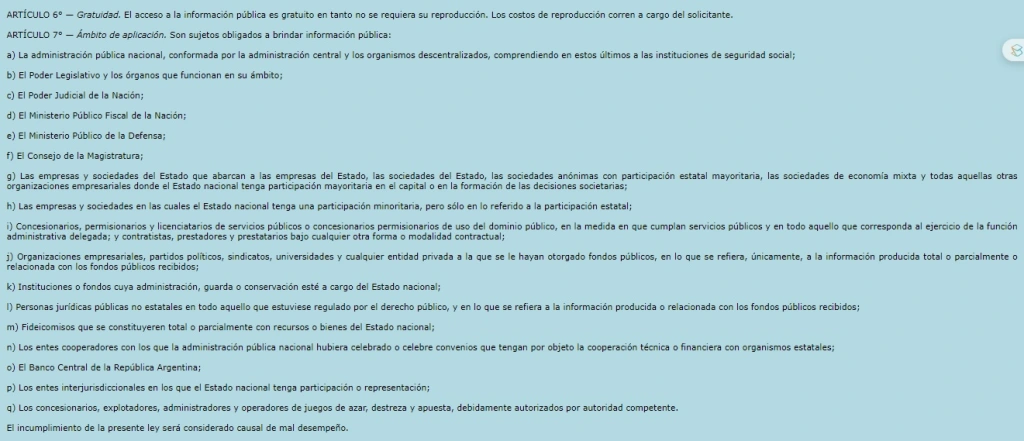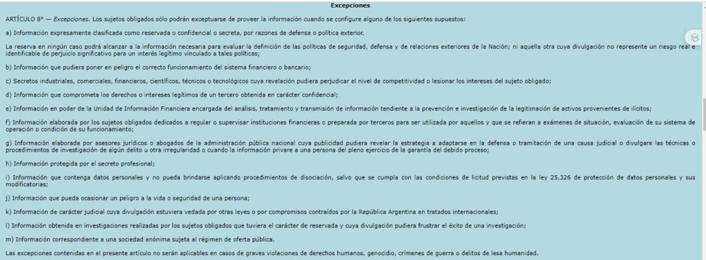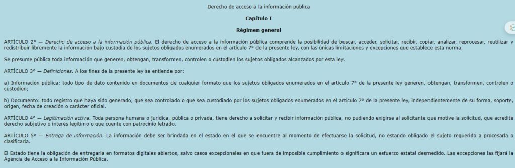 La Ley de Acceso a la Información Pública abarca «todo registro que haya sido generado, que sea controlado o que sea custodiado» por la administración pública nacional, los tres poderes del Estado, empresas y sociedades con participación estatal, concesionarios de servicios públicos, empresas, partidos políticos, sindicatos, universidades y cualquier entidad privada beneficiaria de fondos públicos, el BCRA y concesionarios de juegos de azar, e/otros. La norma defiende los principios de máxima publicidad, transparencia y divulgación, acorde a estándares internacionales.
