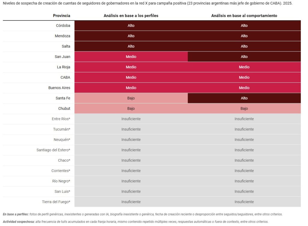 Así, el estudio identificó que las cuentas relevadas en tres provincias (Córdoba, Mendoza y Salta) tienen un nivel “alto” de sospecha tanto en sus perfiles como en su actividad. En otras cinco el nivel sospechoso es “medio” (La Rioja, Buenos Aires, CABA, San Juan y Santa Fe) y en una el nivel es “bajo” (Chubut). Del resto, hay 9 provincias (Entre Ríos, Tucumán, Neuquén, Santiago del Estero, Chaco, Corrientes, Río Negro, San Luis y Tierra del Fuego) donde la cantidad de información recolectada es “insuficiente” como para hacer una interpretación concluyente.