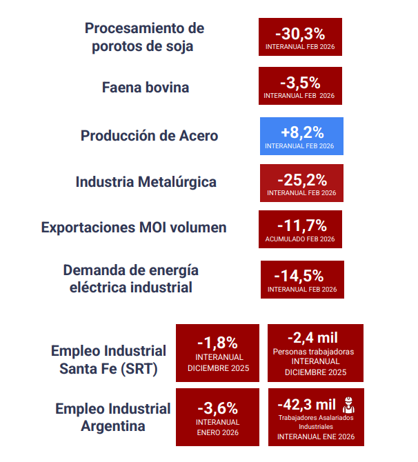 Desde el segundo semestre de 2025 la tendencia se acentuó mostrando variaciones mensuales desestacionalizadas negativas. En relación a diciembre de 2023 la caída afectó a 67,4 mil trabajadores (-5,7%). En enero de 2026 el empleo disminuyó -en la medición interanual- en todos los sectores de la industria manufacturera, siendo “textiles, confecciones, cuero y calzado” (-11,5%), “automotores y neumáticos” (-4,5%) y “metalmecánica” (-4,3%) los más afectados. Según el informe, en los cinco últimos meses 5 mil personas -promedio mensual- perdieron su trabajo industrial.