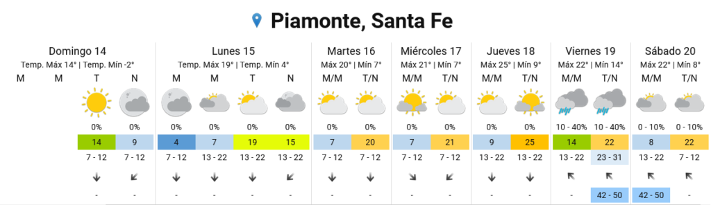 Según el pronóstico extendido del Servicio Meteorológico Nacional (SMN), el martes la temperatura mínima marcará 7° y la máxima 20°, similar al miércoles. Ya para el jueves la amplitud irá de los 9° a los 25°. El viernes, el momento más frío se ubicará en los 14°, con una máxima de 22°, y con probabilidades de algunas lluvias aisladas.