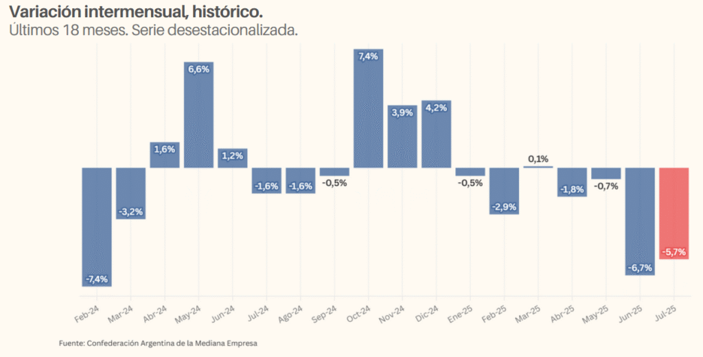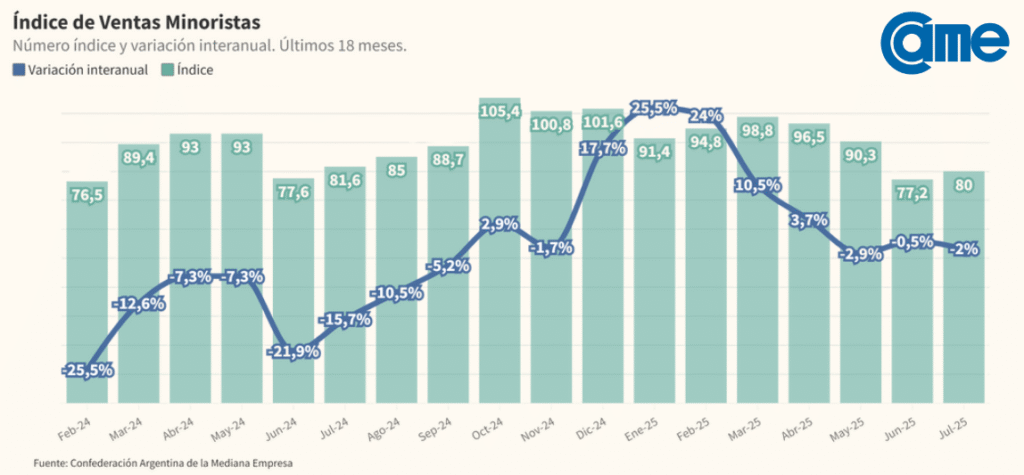 La Confederación Argentina de la Mediana Empresa (Came) publicó su último informe sobre ventas minoristas pyme. Según el relevamiento, en julio marcaron un retroceso en la medición interanual con una baja del 2% a precios constantes. Comparado con el mes anterior, el descenso fue aún más marcado, con una disminución del 5,7 %. Por otra parte, en lo que va del año, las ventas acumulan un crecimiento interanual del 7,6%, marcando una mejora respecto al mismo período del año pasado. La comparación es con un 2024 con números rojos para el sector.
