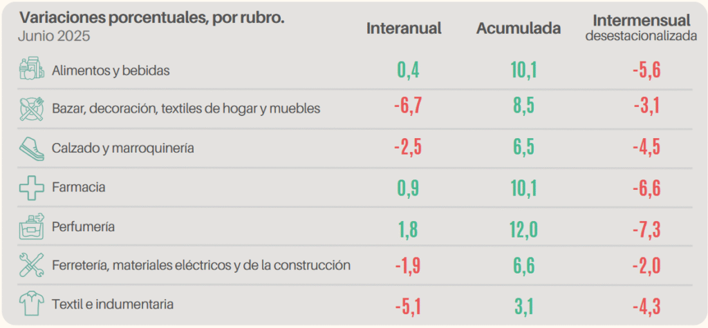 En sentido contrario, cuatro rubros presentaron caídas. “Bazar, decoración, textiles para el hogar y muebles” mostró la mayor retracción con un 6,7%, seguido por “Textil e indumentaria” (-5,1%), “Calzado y marroquinería” (-2,5%) y “Ferretería, materiales eléctricos y de la construcción” (-1,9%).