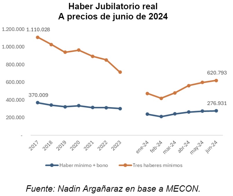 “En términos de junio de 2024, el haber promedio mensual en 2017 equivalía a $370.000”, señaló Argañaraz. A partir de entonces, las jubilaciones comenzaron a disminuir, alcanzando un mínimo de $212.400 en febrero de este año. “Este fue el mes de menor poder adquisitivo de los últimos años, con una caída del 43% respecto al promedio de 2017”, explicó el economista.