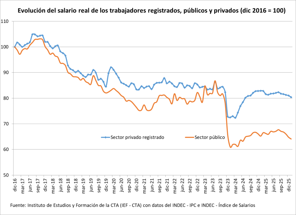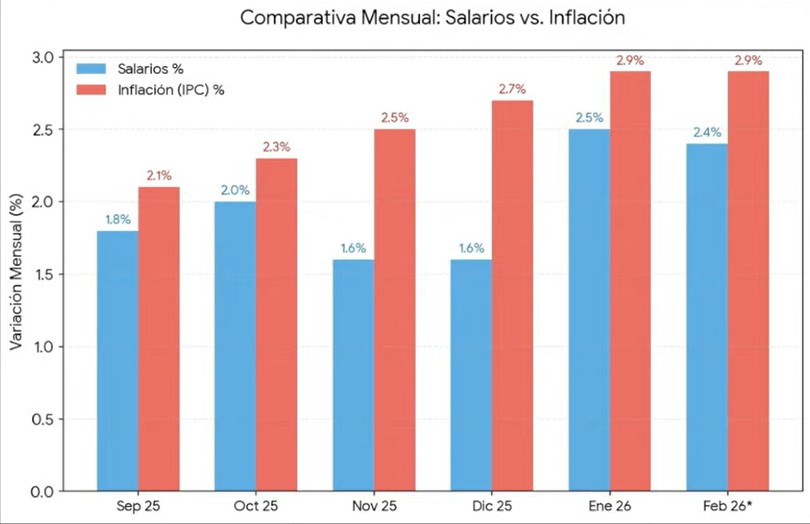 Sin embargo, la variación mensual quedó por debajo del aumento del Índice de Precios al Consumidor (IPC) de enero, que fue del 2,9% según el mismo organismo, lo que implicó una nueva pérdida de poder adquisitivo para los trabajadores formales.