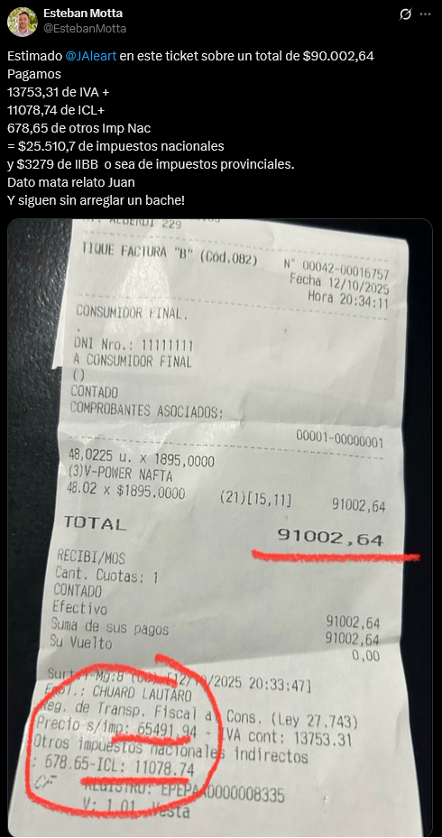 “¡Buena idea Juan! Voy a presentar el proyecto de adhesión así queda claro que la presión fiscal más alta es la del gobierno nacional y no te arreglan un bache en una ruta”, ironizó Motta, e insistió con el ejemplo: “En este ticket, sobre un total de $90.002,64 pagamos 13.753,31 de IVA + 11.078,74 de ICL + 678,65 de otros impuestos nacionales = $25.510,7 de impuestos nacionales y $3279 de IIBB o sea de impuestos provinciales. Dato mata relato Juan. ¡Y siguen sin arreglar un bache!”.
