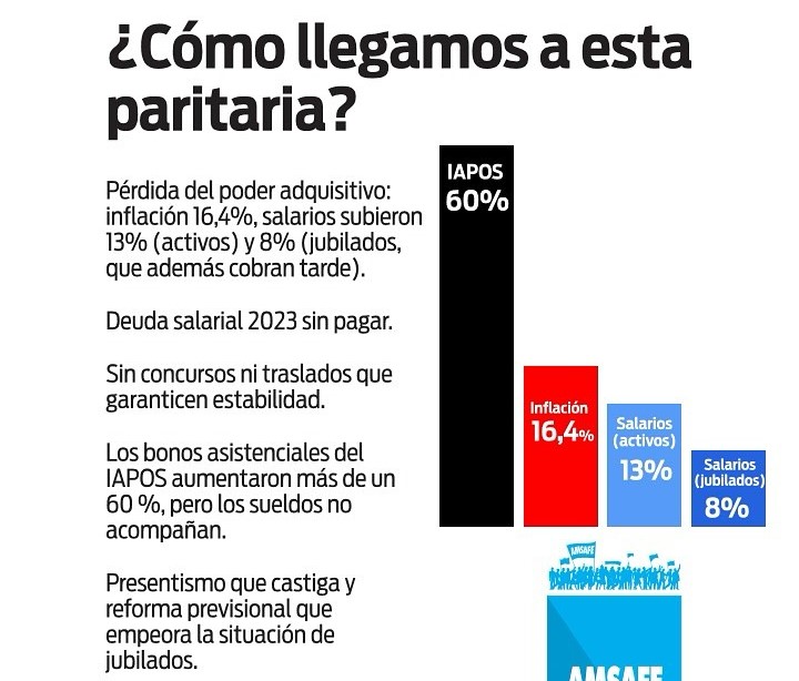 Desde el gremio de los docentes de escuelas públicas afirmaron que uno de los principales puntos de desacuerdo fue el diagnóstico económico presentado por el Ejecutivo, el cual sostiene que los salarios docentes habrían superado a la inflación. “Desde Amsafe se expresó con claridad que esta afirmación no refleja la realidad que viven miles de docentes, quienes enfrentan una pérdida sostenida del poder adquisitivo, agravada por una inflación acumulada del 16% en el primer semestre del año frente a incrementos salariales del 13% para trabajadores activos y del 8% para jubiladas y jubilados”, contrastaron.