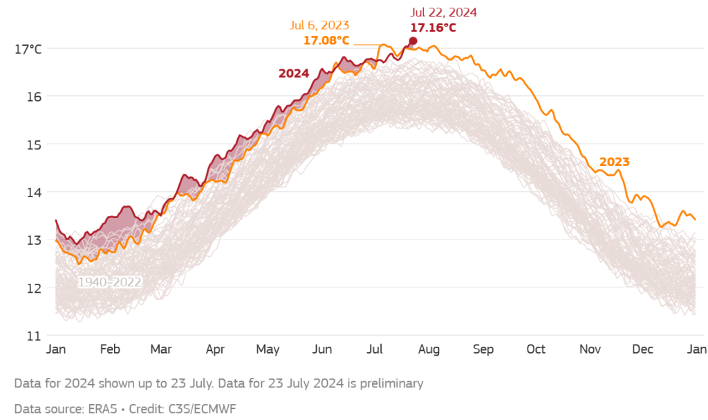 El termómetro mundial de este lunes marcó una temperatura promedio en todo el planeta de 17,15ºC. “El día más caluroso de la serie histórica que arrancó en 1940”, explicaron desde el programa Copernicus. Este valor superó el anterior récord que se había medido 24 horas antes, con 17,09ºC. El anterior techo databa del 6 de julio de 2023 con 17,08ºC.