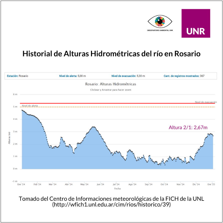 El río Paraná en la ciudad de Rosario presentó una altura el 2/1/25 de 2,67 m, con una tendencia que fue creciente en las semanas previas y desde el 30/12/24 muestra una tendencia bajante aunque mínima. Esta altura, no obstante, está lejos de los niveles de alerta y lejos de la altura registrada durante la creciente ordinaria de principios de año. Por otro lado, el último informe del Instituto Nacional del Agua, emitido el 26 de diciembre, indica que el escenario en las próximas semanas será diferente.