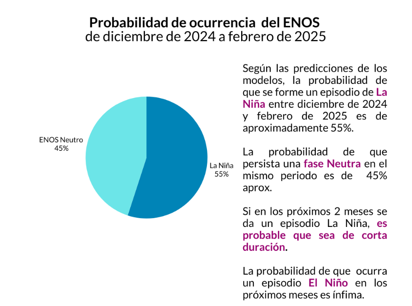 El último boletín de “El Niño/La Niña Hoy” de la Organización Meteorológica Mundial (OMM), emitido el 11 de diciembre, pronostica en un 55% la probabilidad de que, entre diciembre de 2024 y febrero de 2025, las condiciones actuales del clima (neutras, en las que no se produce ni El Niño ni La Niña) evolucionen hasta dar lugar a un episodio de La Niña, que sería débil. Sin embargo, entre febrero y abril de 2025, volverían las condiciones neutras.