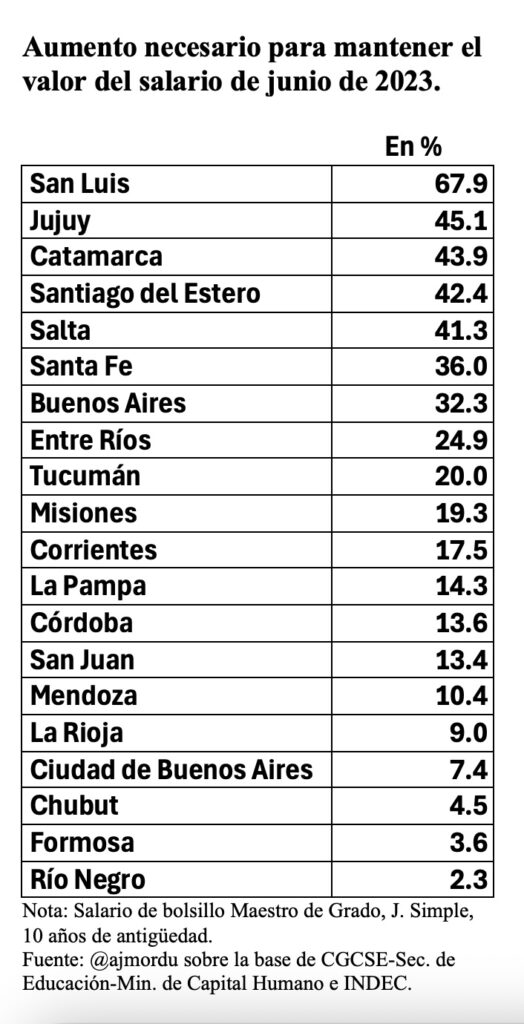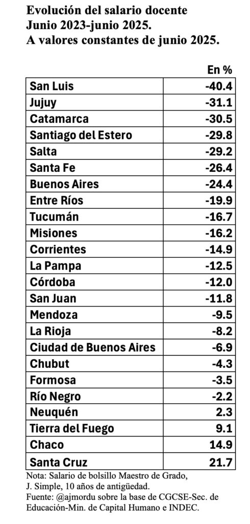Por último, Morduchowicz recordó que el Fondo Nacional de Incentivo Docente (Fonid) que eliminó la gestión de Javier Milei significaba entre el 5% y 8% del salario. Por encima de esas cifras, “las caídas son atribuibles solo a las provincias donde ocurren”. El dato demuestra que el ajuste es compartido por el Gobierno nacional como por las gobernaciones.
