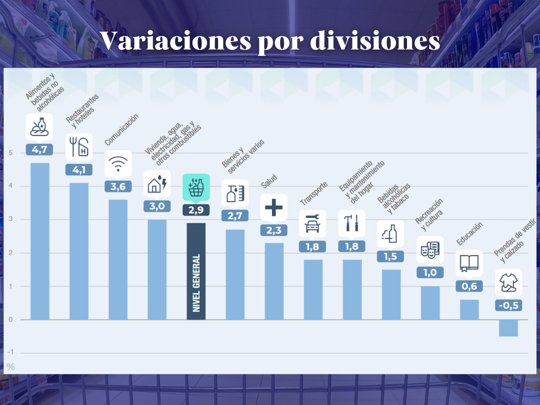 Por otro lado, las dos divisiones que registraron las menores variaciones en el primer mes del año fueron Educación (0,6%) y Prendas de vestir y calzado (-0,5%).
