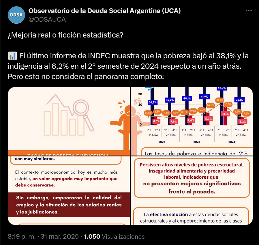 “Esto explica por qué, si bien se observan similares niveles de pobreza e indigencia que hace un año atrás, continuaron aumentando la pobreza multidimensional, la inseguridad alimentaria, la imposibilidad de acceder a medicamentos o servicios de salud, los impagos de deudas o la imposibilidad de reparar la vivienda”, afirmó el ODSA en un informe.