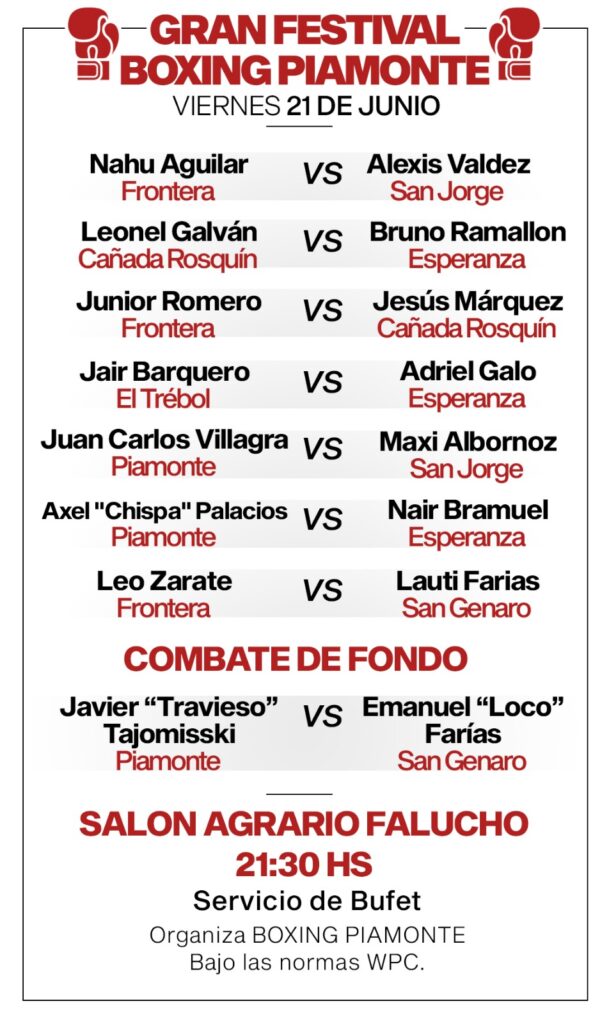 Este viernes, a partir de las 21:30, se realizará el Gran Festival de Boxing Piamonte en el salón del Centro Juvenil Agrario Falucho.